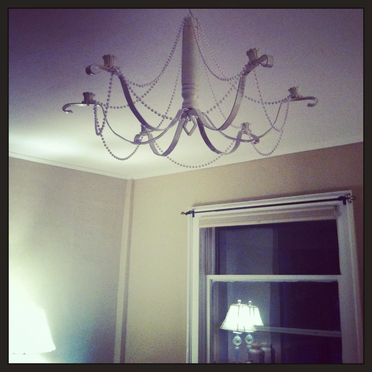 Stefan's mom gave the original chandelier a few coats of ivory spray paint. I took some pearl bead garland that my mom gave me to use for the wedding and cut 12 strips. Six strips were to drape from the top of the fixture to the base of each candle holder and the other six were to drape from each candle base to the next. I measured the length I wanted the beads to drape before I started cutting. Then I simply started hot glueing the end of each strand and attaching it to the chandelier. It took a half hour tops. I was so excited to see it.. I put it up before spray painting the beads ivory to match. After a few days of admiration I was ready to complete it. I gave the entire thing a few coats of ivory spray paint, let it dry, and have been gawking over it since. It was SO easy to do and I didn't have to buy a thing!! Definitely an upgrade from before.
